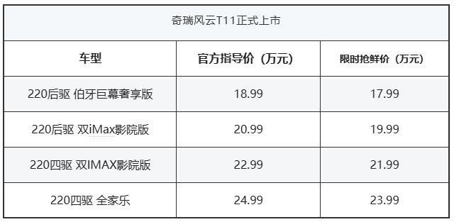 10月30日,奇瑞风云T11正式上市,包含四款车型,官方指导价区间18.99-24.99万元;超级增换购限时抢鲜价区间17.99-23.99万元。