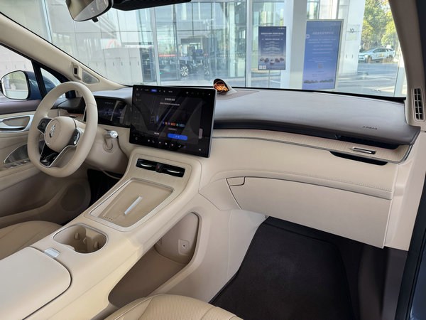 内饰方面,尚界H5采用了双层环抱式座舱设计,营造出对称秩序之美。用料上,仪表台大量使用软质材料包覆,手感十分细腻,再搭配门板温润舒适的麂皮绒材质,营造出相当不错的品质感。皮质多功能方向盘、10.25英寸全液晶仪表以及15.6英寸中控屏,均为全系标配