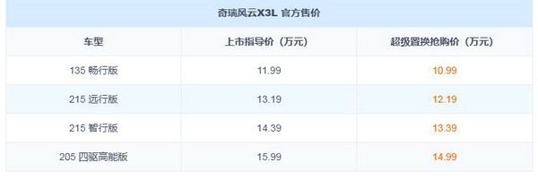 9月17日,奇瑞风云X3L正式上市,新车共有4款车型配置,官方价格区间为11.99-15.99万元,置换价10.99-14.99万元。新车主打的是方正的外观设计,颇具野趣,而且方正的外观造型也能带来更多的车内空间。新车采用1.5T发动机组成的增程式动力系统,单电机驱动系统最大功率185千瓦,峰值扭矩为300牛·米,双电机驱动系统最大功率为315千瓦,峰值扭矩为505牛·米,0-100km/h加速4.7秒。电池容量为33.68度的磷酸铁锂电池,纯电续航215公里,综合续航1200公里,30%-80%快充20分钟,高配车型还配备FSD可变阻尼减振器。搭载猎鹰500智驾辅助驾驶系统,可实现高速领航、城市记忆领航、遥控泊车、循迹倒车、跨层记忆泊车等。