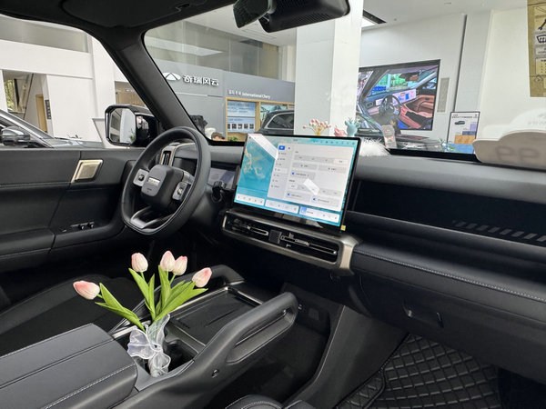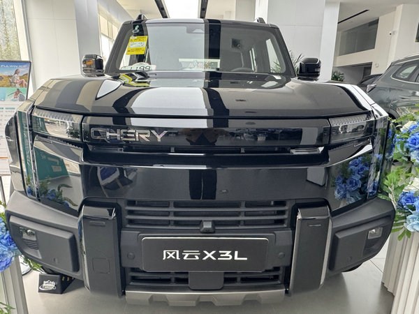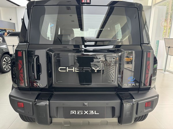 外观方面,新车采用方盒子SUV造型,前脸部分由一块黑色装饰板贯穿两侧灯组,形成贯穿式的视觉效果。日间行车灯呈现字母“i”形设计,中央镶嵌可发光的“CHERY”英文标识,点亮后辨识度极高。前牌照框位于进气格栅内部,格栅两侧及轮拱均采用黑色无漆材质饰板,搭配前发动机舱盖上的多条筋线,营造出浓郁的越野气息,视觉效果肌肉感和力量感十足。