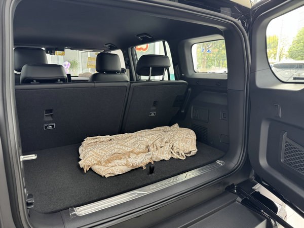 车尾部分,新车尾灯采用竖置式设计,辨识度较高。尾门采用平开式设计且配备电吸门功能,提升了实用性,即使在狭窄空间也能轻松开启。尾门上带有外挂“小书包”,但这个“小书包”并非传统的备胎,而是一个容积为48升的储物箱,内置网袋分离区,方便户外使用,整体设计给人硬朗的感觉。排气方面,新车采用隐藏式排气布局,进一步提升车辆的运动属性。
