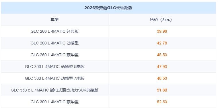 2026款奔驰GLC长轴距版于2025年年底正式上市,新车共推出7款车型,售价区间为39.98-52.53万元。