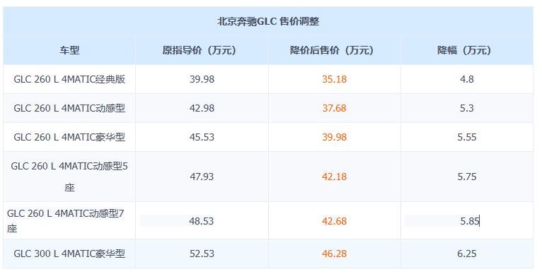 奔驰GLC降价车型分别为GLC 260 L 4MATIC经典版、GLC 260 L 4MATIC动感型、GLC 260 L 4MATIC豪华型、GLC 260 L 4MATIC动感型5座、GLC 300 L 4MATIC豪华型,至高降幅6.25万元,原指导价39.98-52.53万元,降价后35.18-46.28万元。